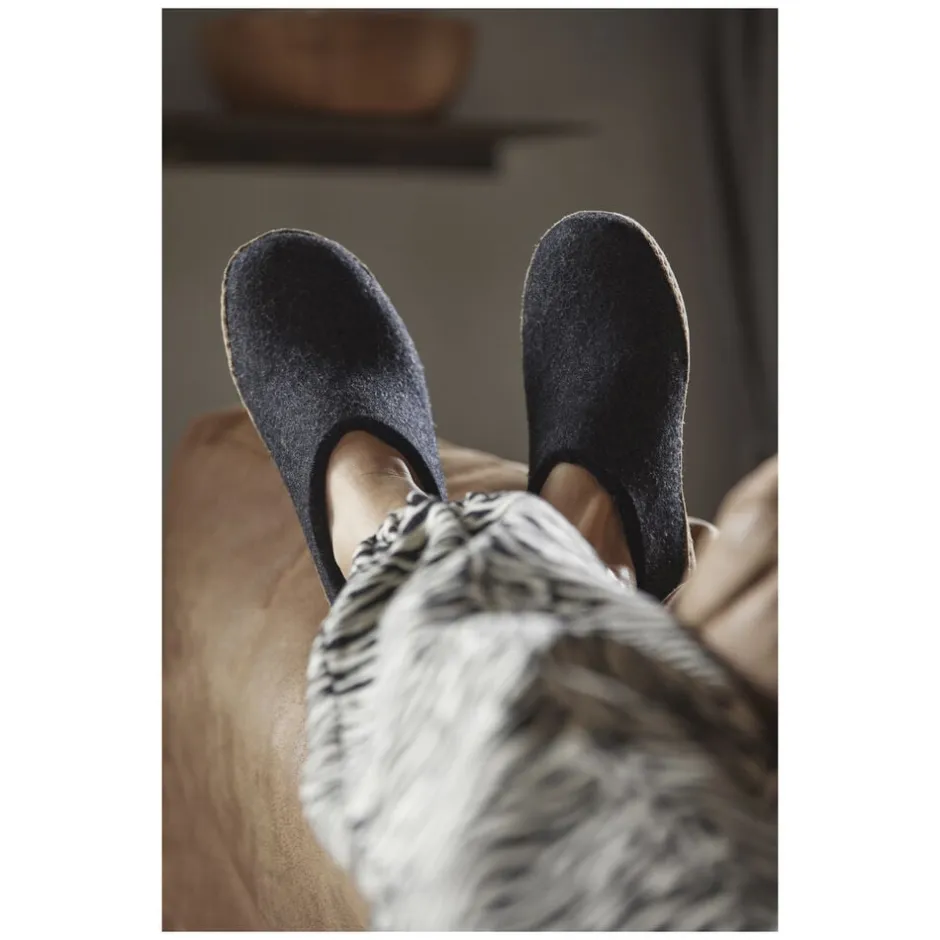 Hjemmeskoene er dansk designet og har overdel i uldfilt der rigtigt forkæler dine fødder. Uld har mange gode egenskaber. Bl.a. mister det ikke sine isolerende egenskaber i fugtig tilstand hvilket sikrer at dine tøfler altid føles lune