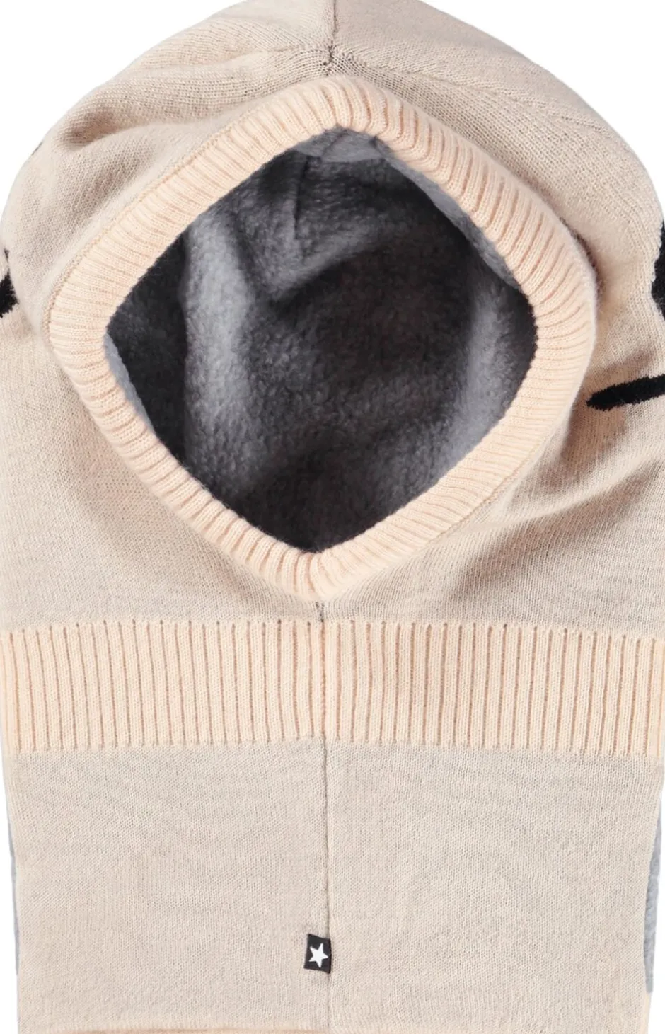 Elefanthue fra Molo med beige smilende ansigter. Huen har indsnit ved halsen, der sikrer, at den sidder til over bryst og skuldre. Fremstillet i en blød uldblanding og foret med blødt fleecefor.