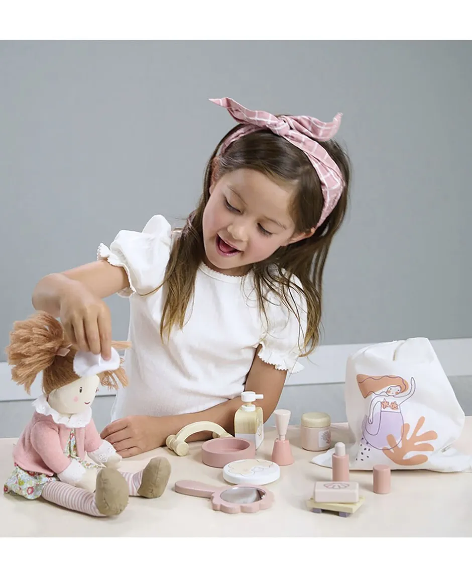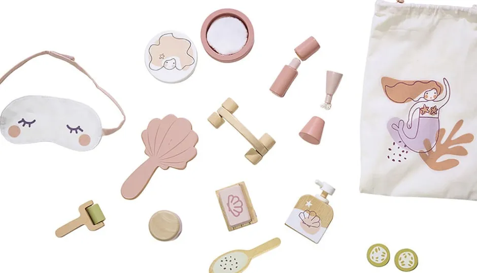 En opbevaringspose med snoreluk og illustration af en smuk havfrue, rummer alt det tilbehør, der skal til et spaophold såsom en stof-øjenmaske, massagerulle, spejl, fodfil, neglelak og skiver af agurk til at dække øjnene.