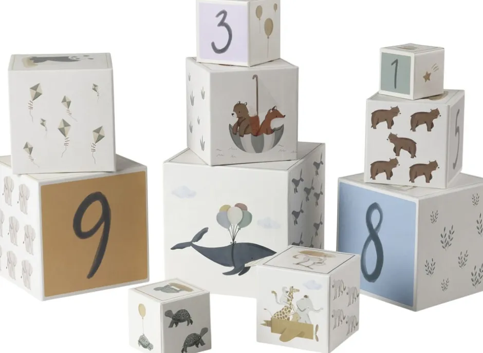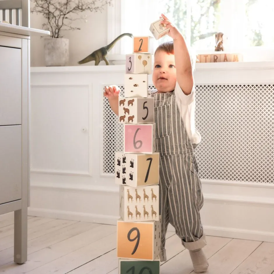Stabelkasserne er i forskellige størrelser og har tallene fra 1 til 10 trykt på. For børn, der er ved at lære at tælle, er der meget sjov træning i at sætte kasserne oven på hinanden i den rigtige rækkefølge… for så igen at vælte dem og begynde forfra. De kan også puttes ind i hinanden, så de fylder ganske lidt.