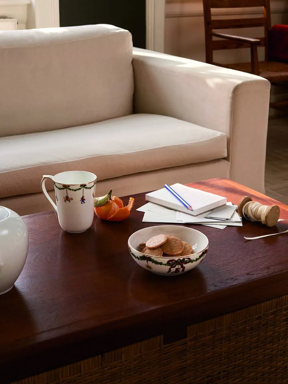 Skålen er oplagt til servering af nødder, frugt eller som morgenmadsskål. Skålen er dekoreret med et udvalg af juledekorationer som inkluderer en bamse og småkager