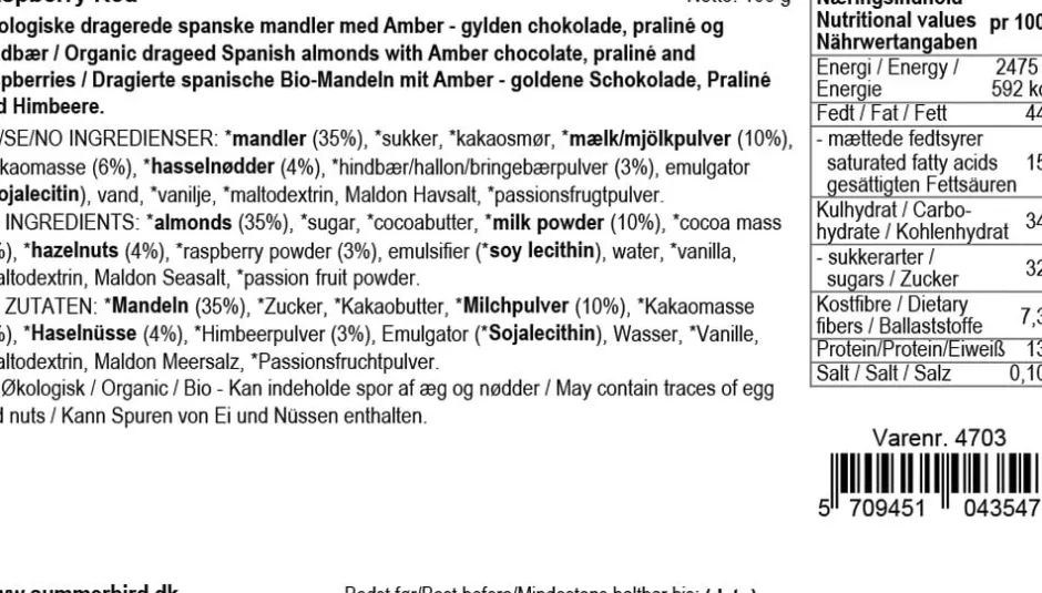 Let ristede økologiske spanske mandler, drageret i praliné, Amber Classic-chokolade og vendt i det fineste pulver af solmodne hindbær. En mandel med sødme og frugtighed fra de solmodne hindbær, dybde fra den karamelliserede Amber Classic-chokolade og umami fra de sprøde spanske mandler.