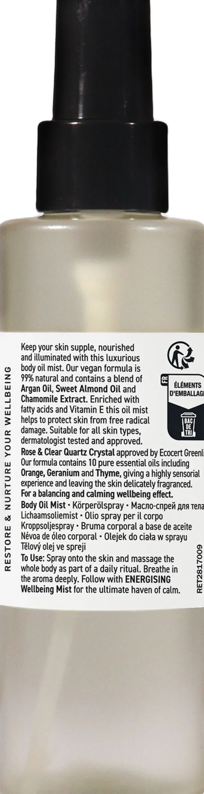 150 ml. body oil mist med rose og klar quartz-krystal blanding. 99% naturlig letvægtsformel med arganolie, sød mandelolie og beroligende kamilleekstrakt, der fugter og blødgør huden. Beriget med essentielle fedtsyrer og vitamin E, der beskytter huden mod oxidante skader.