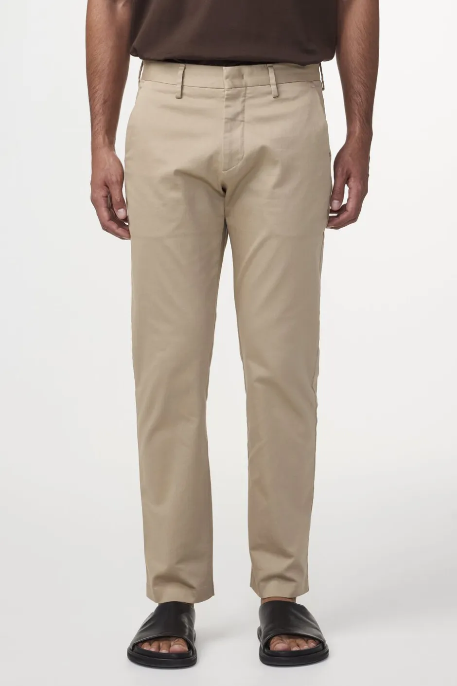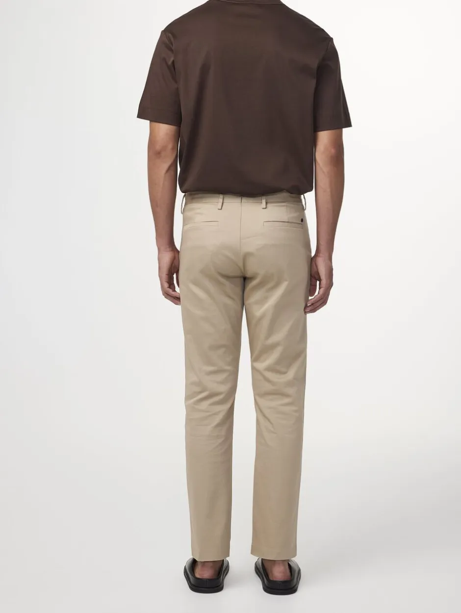 Theo er en chino i hjertet, men med de formelle elementer i en kjolebuks. Den er fremstillet i BCI-fremstillet børstet bomuld fra den italienske mølle Progetto Uno. Disse alsidige bukser med mellemhøj talje har en indsnævret pasform. Den er afsluttet med en skarp fold ved benet og usynlig oplægning