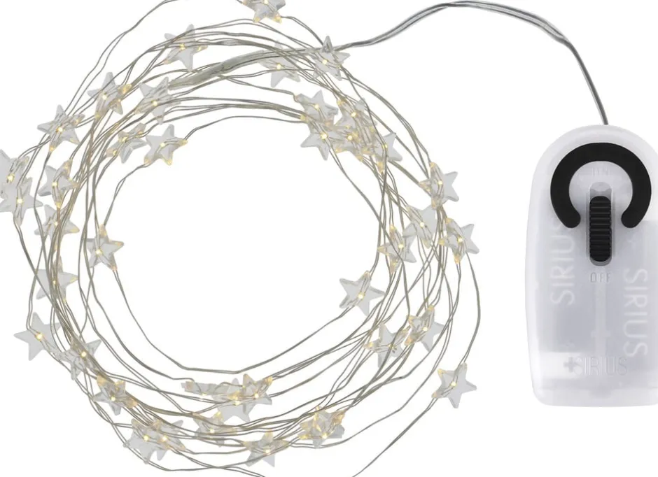 Sirius Batteri-lyskæden Trille har 40 meget små fine LED lys hvor der er påsat små (1 cm) klare stjerner Kæden er lavet med en fin sølvtråd der er snoet rundt om den transprarente ledning. Meget dekorativ kæde. Kæden har en udendørs batteriboks, og er velegnet til at skabe stemningsbelysning ude i haven. Kæden er 3,9 meter lang, og har et varmt naturligt lys. Dekorationen er batteridrevet og har en indbygget timerfunktion, der slukker lyset automatisk efter 6 timer, hvis du ikke selv slukker dem. Efter 18 timer tænder lyset igen, og sådan vil det fortsætte, hvis du ikke bruger sluk knappen. Batterier medfølger ikke. Der skal isættes 2 AA Batterier.