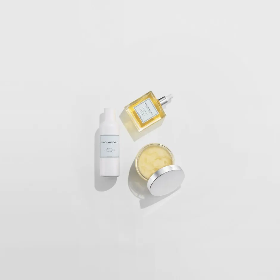 Man kan hjælpe et sundere udseende på vej ved at exfoliere huden forsigtigt med Tromborgs Body Salt Scrub, som fjerner døde hudceller, så huden får et mere levende skær. Skrubben er blid og exfolierende med fint salt fra Det Døde Hav, mandelolie og æteriske olier.