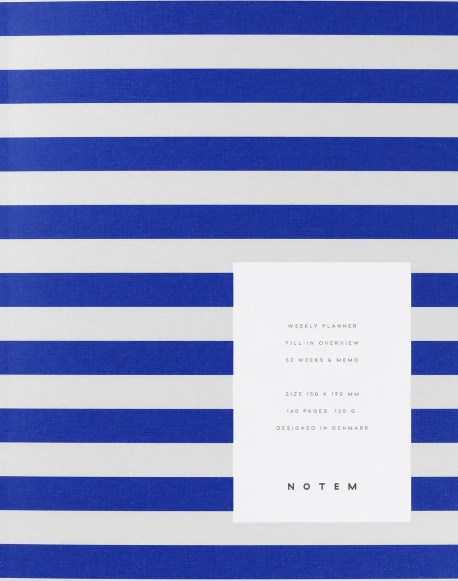 Softcover Weekly Planner fra Notem Studio. Bogens ryg er syet og ikke fæstnet til coveret, hvilket giver en plan flade når bogen åbnes. Indhold: Ugeplan (venstre) / noter (højre) 160 sider, Linjeret. Farve: Blå stribe. Mål: 150 x 190 mm. Designet i Danmark, produceret i Europa.