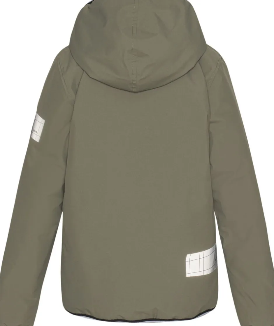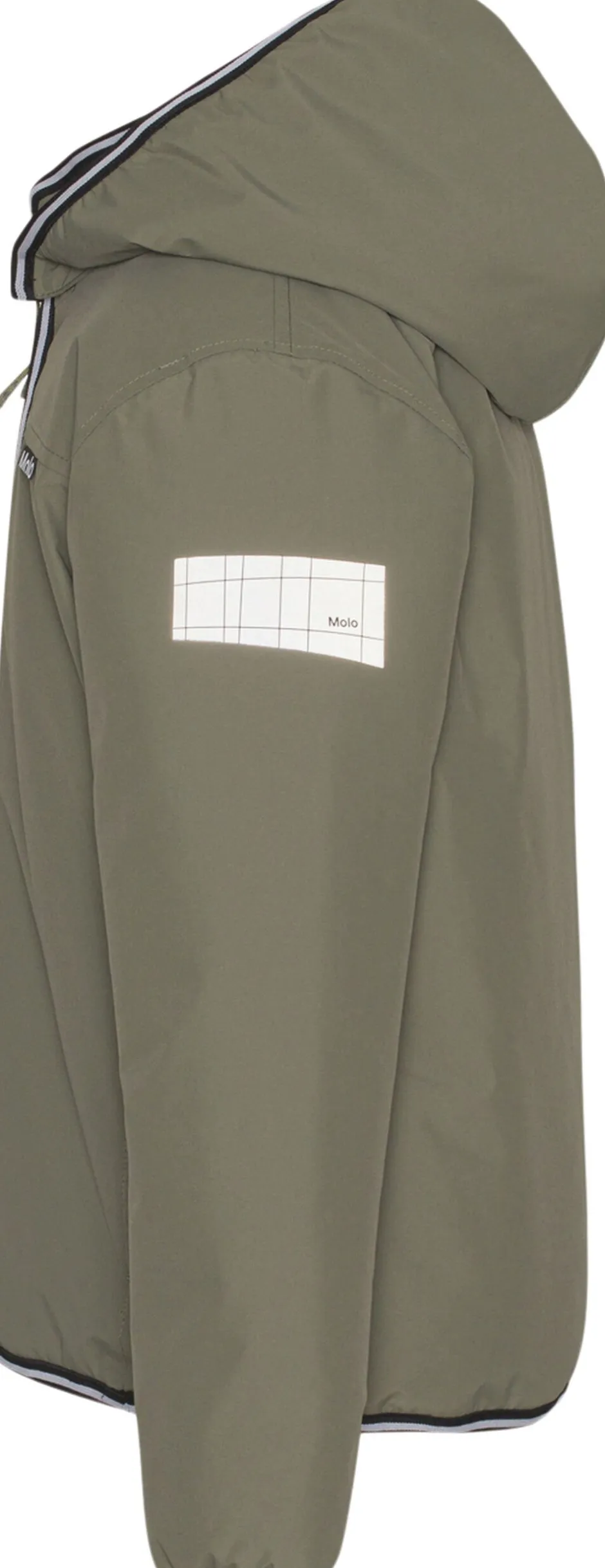 Smart mørkegrøn vind- og vandtæt allround jakke. Jakken har en fleeceforet aftagelig hætte, lommer i siderne, elastik ved ærmerne, og har den velkendte Molo stjerne refleks bagpå samt på det ene ærme, så børnene ses i mørket. Bukserne har desuden foret med en invendig flat padding, som gør dem bløde og hjælper til at holde på varmen. Ydermateriale, for, samt inderstof er fremstillet af delvist genanvendt polyester fra brugte plastikflasker og andet restaffald.Herved bruges der langt færre ressourcer samt en væsentlig mindre udledning af CO2.Miljøvenlig vand- og smudsafvisende coating uden brug af kemikalier som PFOS, PFOA og lign. Vandsøjletryk: 5.000 mm. Åndbarhed: 5.000 g/m2/24t.