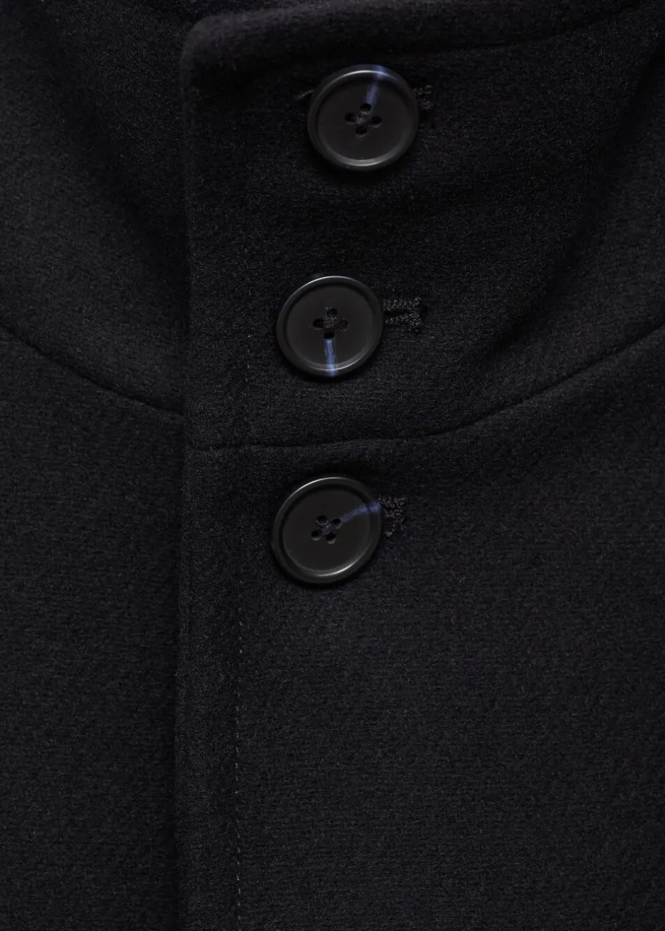 Uldblanding, smal pasform, medium længde, krave med knapper og knaplukning, knaplukning foran, to paspolerede lommer foran, lange ærmer med knapper ved manchetterne, indvendig foring.