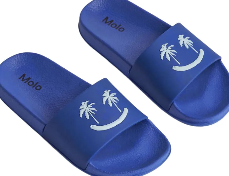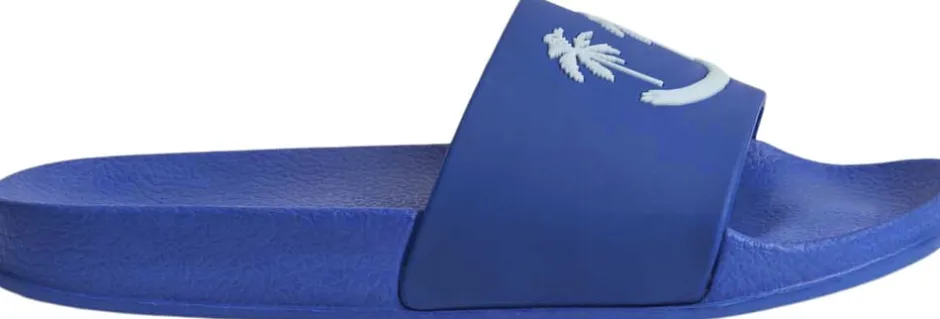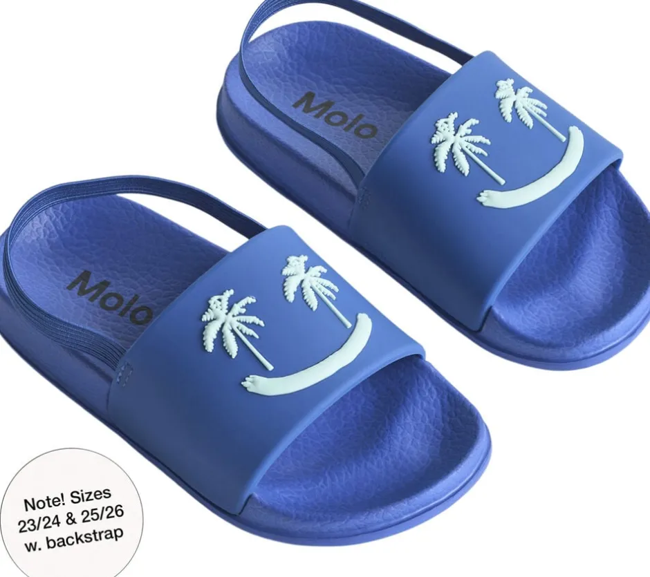 Badesandaler med bred fodrem og formstøbt indersål. Disse sandaler er vandafvisende og ideelle til både poolen og stranden. Fodremmen prydes af et smilende ansigt med palmeøjne.